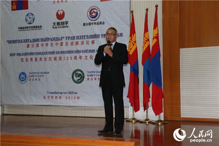 人民网乌兰巴托9月22日电(记者 霍文) 纪念周恩来诞辰120周年蒙古国中学生中蒙友谊主题演讲比赛22日在蒙古国首都乌兰巴托举行。中国驻蒙古国大使馆临时代办杨庆东、全国政协委员周秉建、内蒙古著名歌唱家拉苏荣、朱德元帅外孙女刘丽、大鸾翔宇慈善基金会理事长沈清、乌兰巴托市副市长恩赫图尔、中国驻蒙使馆文化参赞李薇、政治处主任顾一鸣以及蒙古中学生百余人参加。